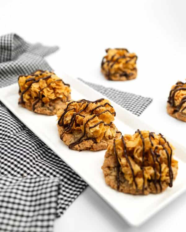 Cowboy crunch! Loaded with coconut, pecans, chocolate chips, topped with candied cornflakes and a chocolate drizzle.