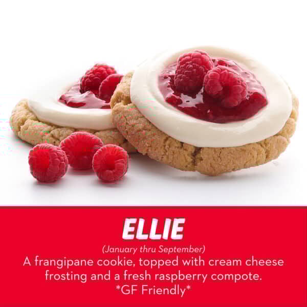 A frangipane sugar cookie, topped with cream cheese frosting and a fresh raspberry compote. *GF Friendly*