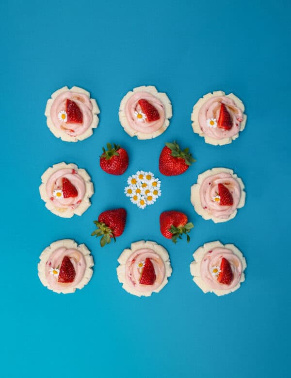 All butter shortbread topped with fresh strawberry frosting and house-made chamomile syrup.